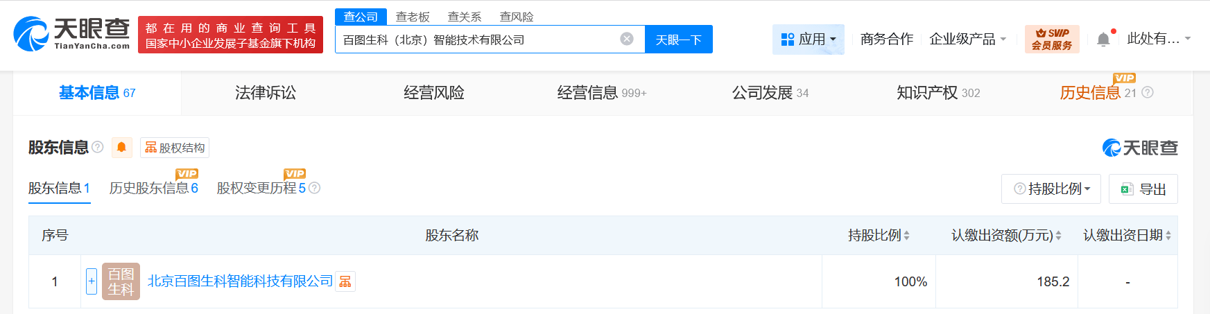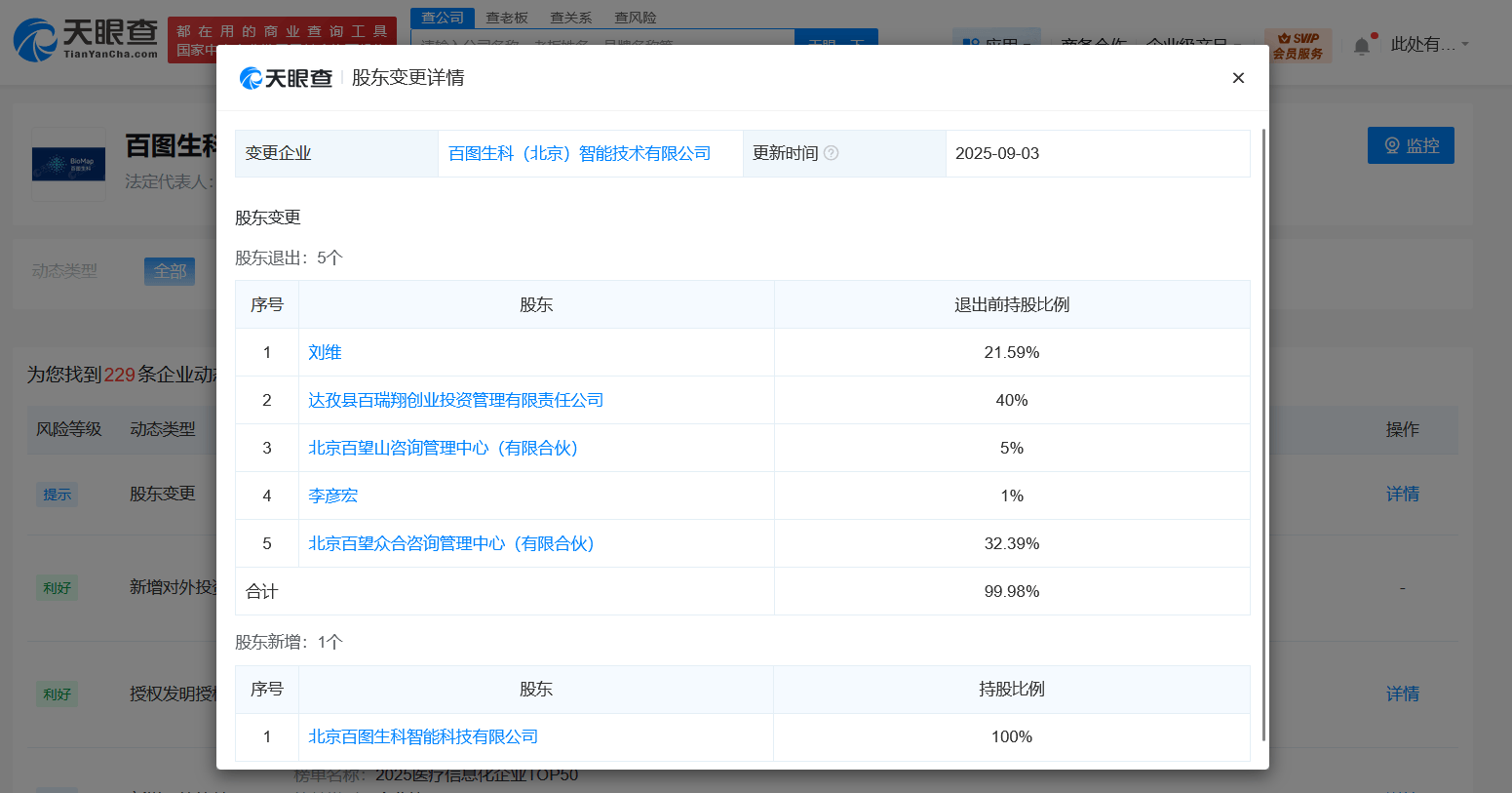 天眼查工商信息显示,近日,百图生科(北京)智能技术有限公司发生工商变更,李彦宏、刘维、百度旗下达孜县百瑞翔创业投资管理有限责任公司、北京百望众合咨询管理中心(有限合伙)等退出股东行列,新增北京百图生科智能科技有限公司为股东并全资持股。